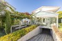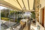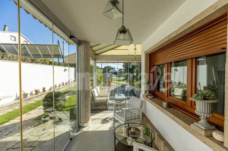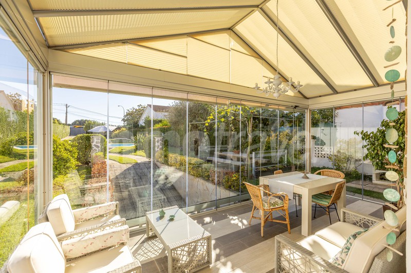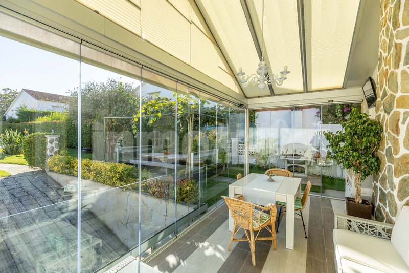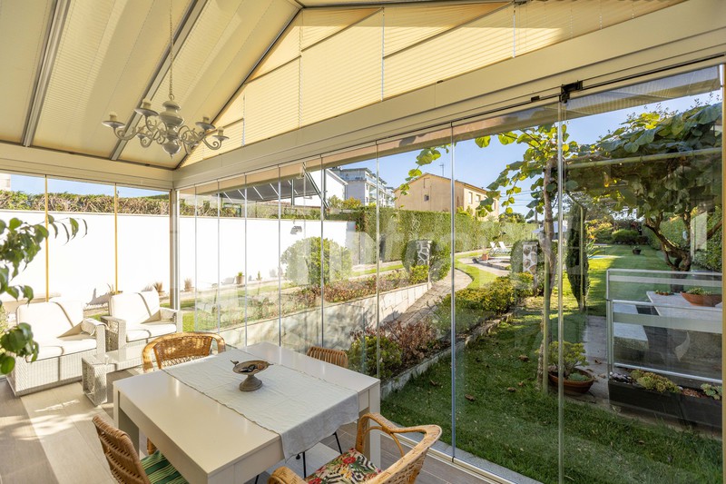 Sobre el acceso al garaje en el sótano se ha instalado recientemente un maravilloso porche cubierto, cerrado perimetralmente con cortinas de cristal Lumon, que permiten el uso de este espacio fuera de los meses de verano, con una confortable temperatura que aporta la orientación al sur. De este modo ganamos la mayor parte de horas de luz del día, incluso en los meses más fríos.
